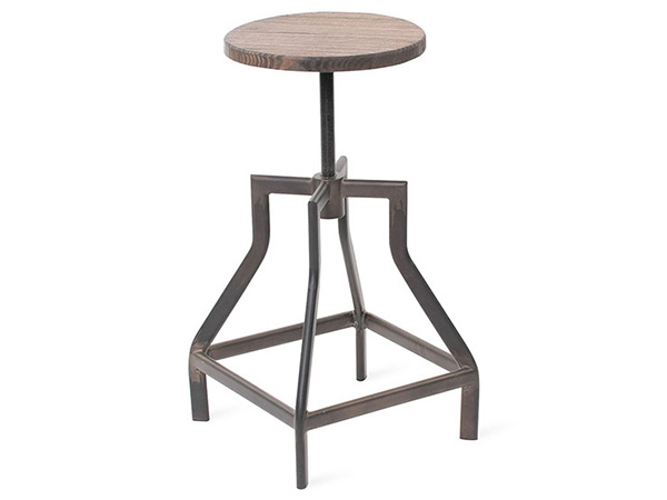 Banco de metal gris con asiento en madera de olmo color chocolate ajustable.