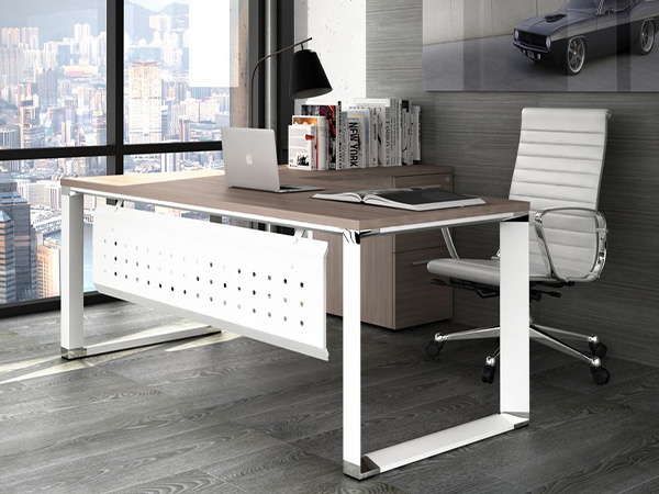 Con un pedestal de 2 papeleros y 1 de archivo con jaladeras rectas de aluminio mate, en melamina.