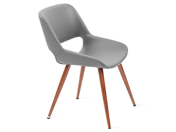 Silla tapizada en imitación piel con base de metal apariencia madera color nogal.
